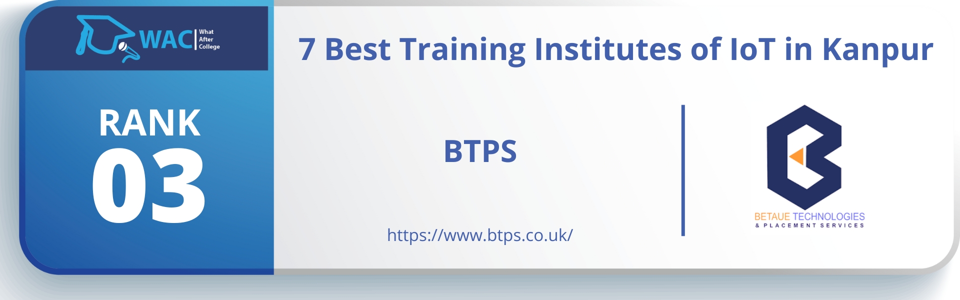 7 Best Training Institutes of IoT in Kanpur Rank 3_ BTPS Published December 9, 2022 at 1920 × 600 in 7 Best Training Institutes of IoT in Kanpur BTPS, Ex-partner of CMC Academy (A TATA Enterprise), is a Pure Training & Software Development company and an IoT institute in Kanpur. ← Previous Next →