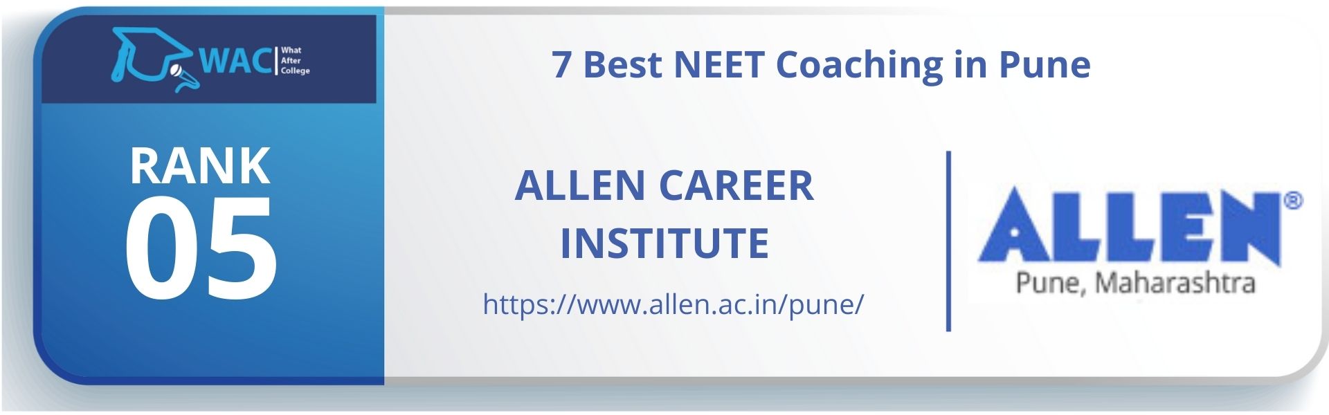 Pune-rank-5 Published January 20, 2022 at 1920 × 600 in 7 Best NEET Classes in Pune | Enroll in Best NEET Coaching in Pune Allen Career Institute provides pre-medical aspirants qualitative academic environment to help them acquire essential skills and education to perform exceedingly well in their NEET exam. ← Previous Next →